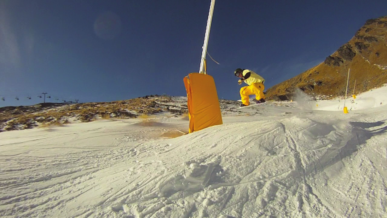 The weeks of brilliant sunshine and warm weather didn’t stop the Queenstown ski-fields opening. Using purely man-made snow, my old stomping ground The Remarkables, opened in-time for the final weekend of Winter Fest. The Big slope-style competition was obviously not possible, but they did put on a Boxzilla comp. Basically they joined up loads of boxes and challenged people to make it to the end. I entered. Not to try and scoop some of the prize money, but to get the free t-shirt that was given to competitors. I did have a couple of attempts to slay Boxzilla, but it was just embarrassing, so headed up the mountain with Lee for the first shred of the season (video is below this post). Despite all the grass and rock on show The Remarks was just as fun as I remember and hopefully I’ll be back when there is some real snow.